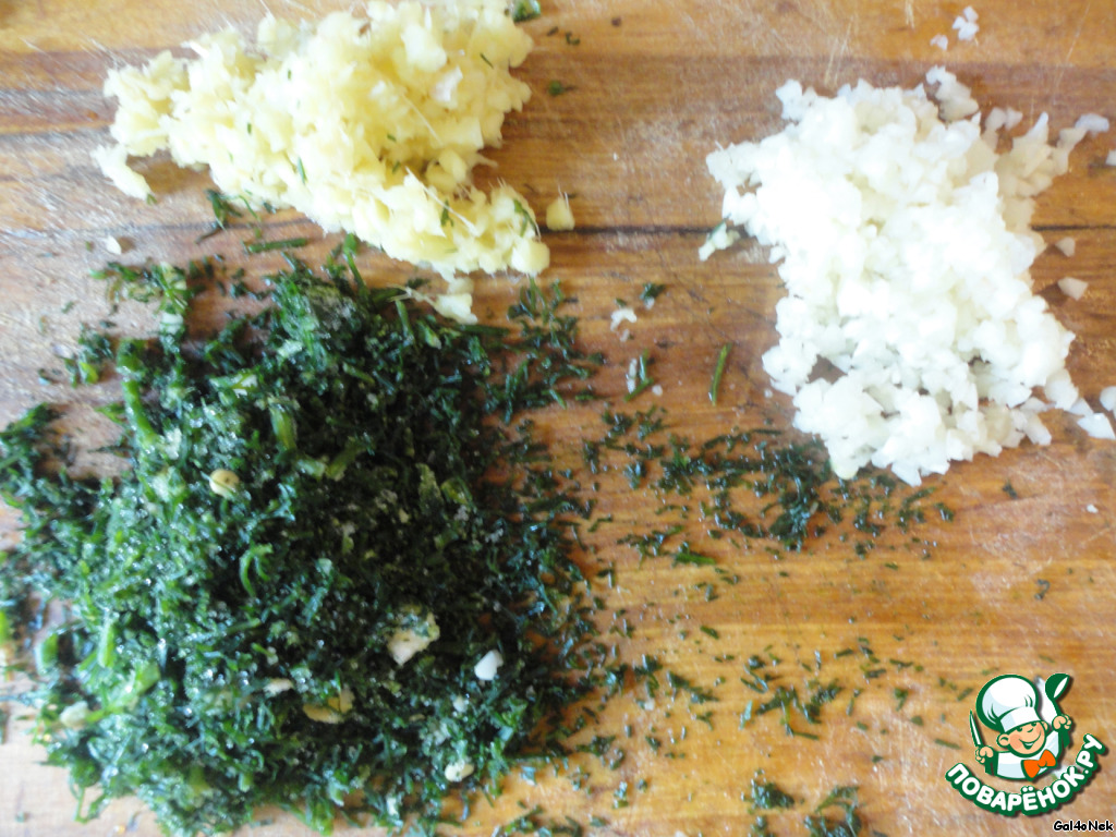Пока наши креветки размораживаются, чеснок, имбирь и укроп мелко шинкуем ножом.
