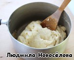 Когда жир растает, добавим в кастрюлю молоко, муку с солью, перемешивая тесто деревянной лопаткой. Мука должна завариться и превратиться в мягкое, эластичное тесто.