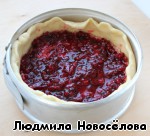Выложим ровным слоем половину начинки, польем клюквенным соусом, оставив примерно треть для подачи.