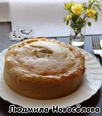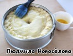 Закрываем пирог тестом, защипываем, смазываем яйцом, в центре делаем отверстие кончиком ножа.