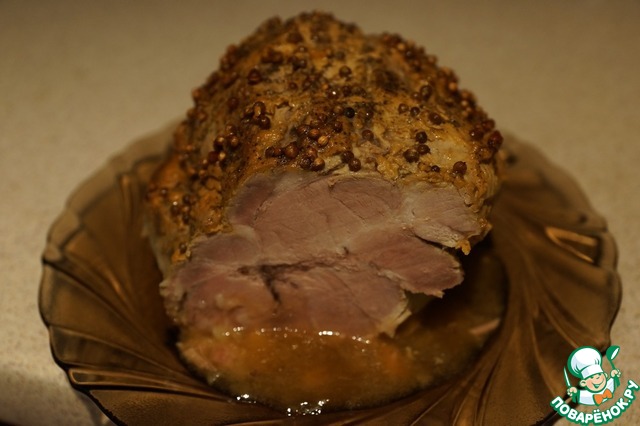 Намазать мясо горчицей, поместить в жаростойкую форму, на дно которой налить немного маринада и масло. Сверху посыпать смесью перцев и кориандра.
