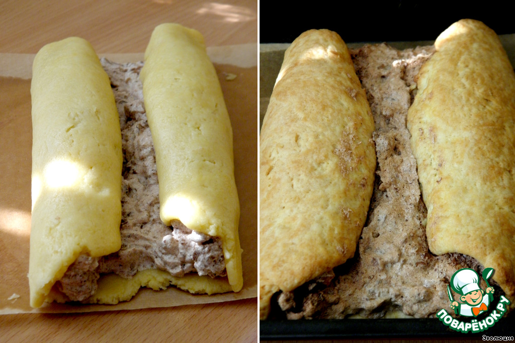 С двух противоположных сторон сворачиваем тесто в рулетики, сильно не сжимая, чтобы не выдавить начинку. Между рулетами должно оставаться расстояние около 2 см.