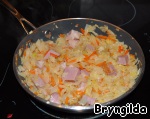 Грудинку копченую нарезать и добавить в сковороду, перемешать.