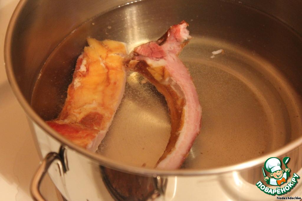 Для начала необходимо сварить бульон на основе копченого свиного ребрышка. Про бульон можно забыть примерно на полчаса. Этого времени хватит, чтобы подготовить все для солянки.