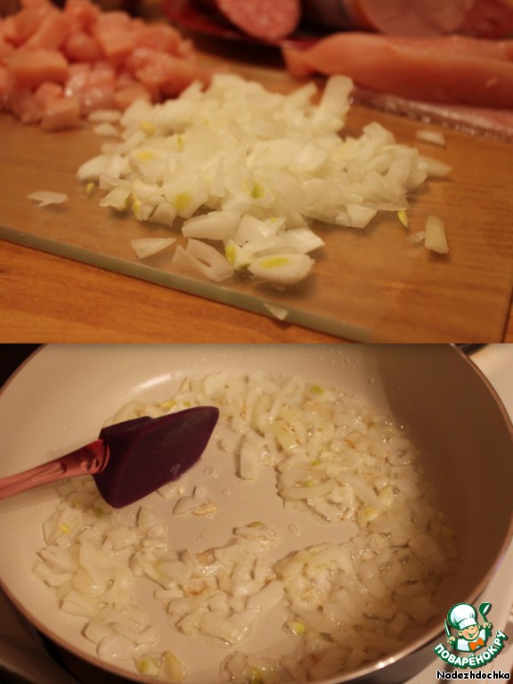 Нарезаем мелко репчатый лук и кидаем его на раскаленную, смазанную оливковым маслом сковороду. Пассеруем,