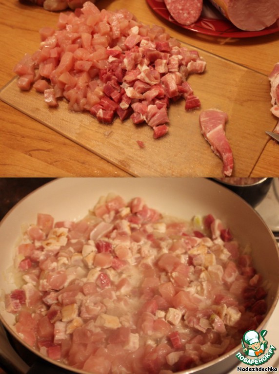 Когда лук подрумянится, добавляем нарезанное кубиками мясо и куриное филе. Тушим несколько минут.