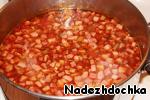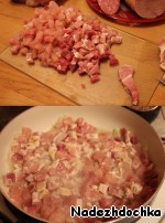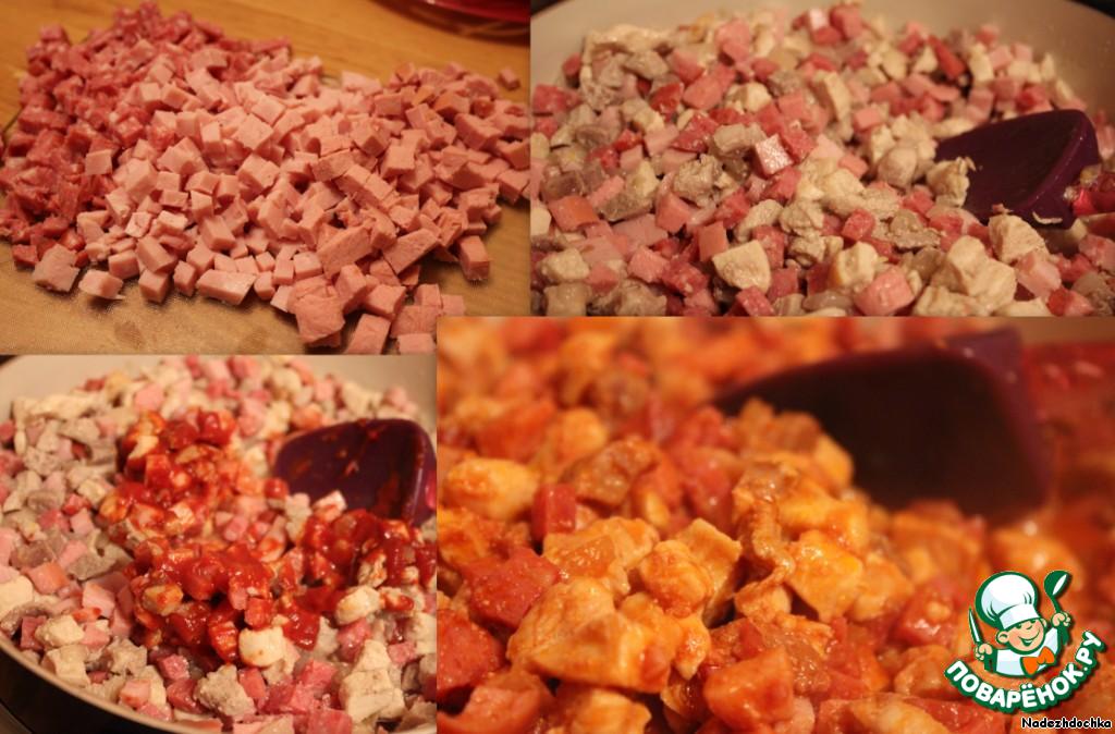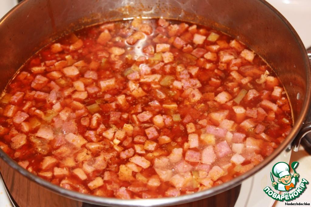 Затем добавляем копченую колбасу, сардельки, ветчину. Все тушим с добавлением томатной пасты. Необходимо все хорошо пассеровать, чтобы не было изжоги.