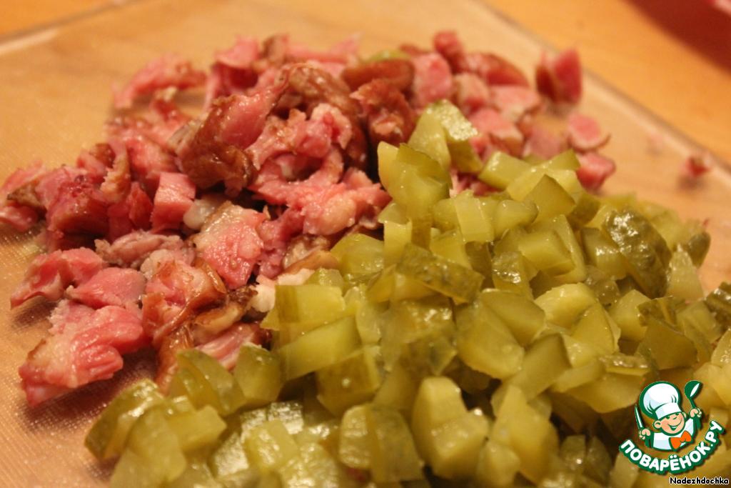Достаем косточку из бульона и срезаем с нее мясо. Режем соленый огурец. Все добавляем к продуктам на сковороду. Перемешиваем.