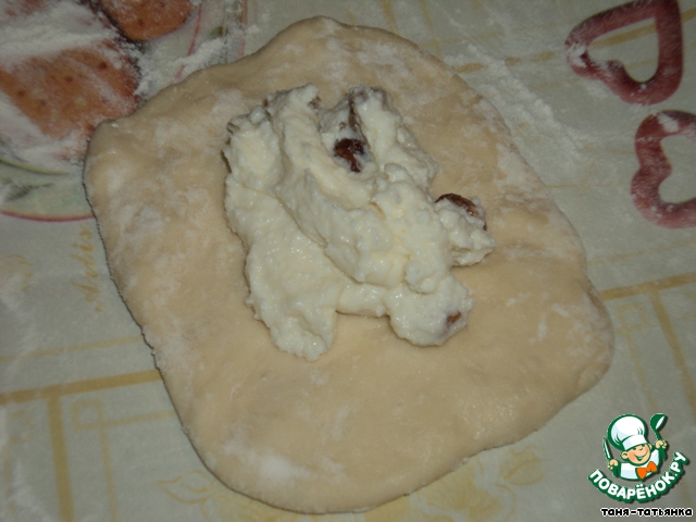 Из теста формируем небольшие лепёшки. В центр лепешки кладем начинку и защипываем края (к центру).