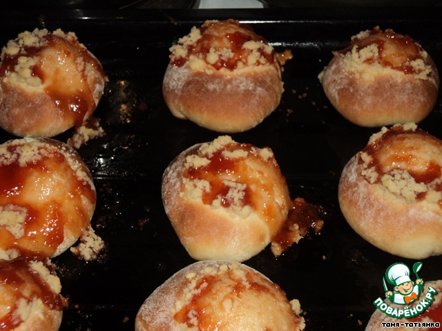 В каждой булочке сделать небольшое углубление. Положить в него по 1 ч. ложке джема.
