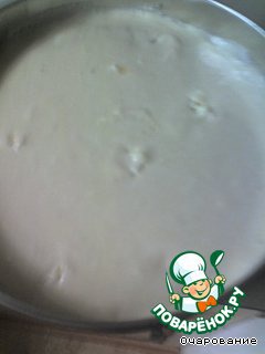 Пока бисквит остывает, готовим начинку. Желатин 40 г залить кипятком 100 мл и проварить на огне, до растворения.