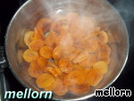 Курагу вымыть. Затем залить 200 мл. горячей водой, добавить сахар (у меня была очень сладкая «медовая» курага, так что 1 стол. ложки более чем достаточно), коньяк и варить на среднем огне примерно 15-20 минут. -