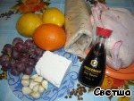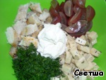 Мясо снять с костей и без шкурки нарезать кубиками. Виноград нарезать на четвертинки, удалить косточки. Укроп берите по своему вкусу, мелко крошим. Брынзу достаем из соуса. Добавляем сметану.