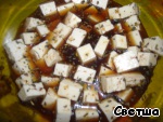 Брынзу нарезаем небольшими кубиками, заливаем соевым соусом, добавляем чуточку сушеного базилика, закрываем крышкой и оставляем мариноваться на ночь.