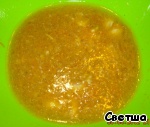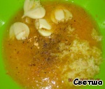В такую емкость, чтобы поместился разделанный цыпленок (я брала глубокую и узкую), наливаем оливковое масло + цедра 1/2 апельсина + цедра 1 лимона + сок апельсина и двух лимонов + 5 зубчиков чеснока давим целиком, а остальной чеснок на чеснокодавке + немного черного перца.