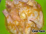 Цыпленка разделываем на части и погружаем в приготовленный маринад. Мясо придавить крышкой так, чтобы все погрузилось полностью. Оставляем мариноваться в холодильнике ночь.