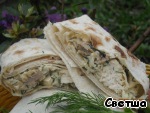 Часть начинки выкладываем на лаваш и делаем конвертик. У меня лаваш был большой, и я его разрезала напополам.