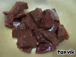 Печенку очищаем от пленок и жилок, нарезаем на кусочки.