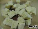 Хлеб нарезаем на кубики и добавляем в миску с печенкой.