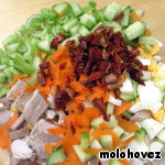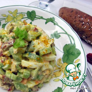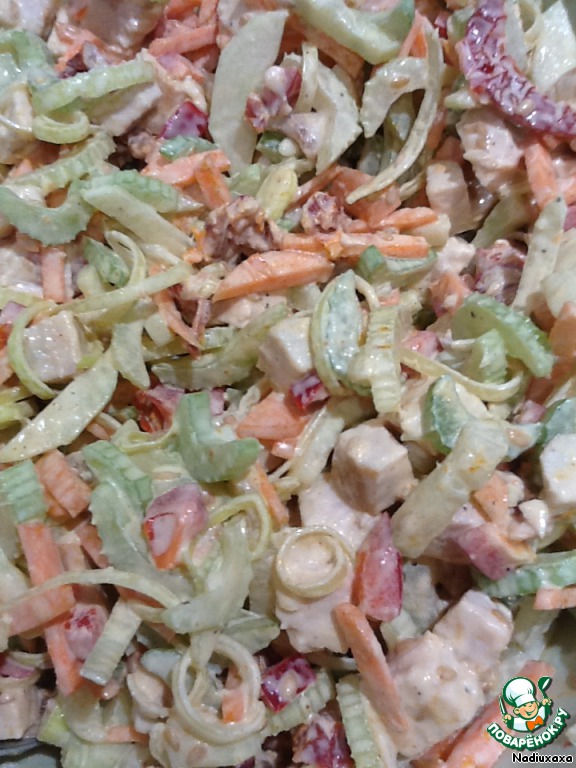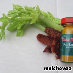 Если вы хотите узнать, что едят голливудские красотки перед сезоном бикини, загляните сюда. Поскольку слово "хлеб" в лос-анжелесских кругах произносить неприлично, то этот салат для сэндвичей перекочевал на тарелку. Сельдерей, то есть его стебли - последняя тема, если вы захотите поддержать small talk о диетах, благодаря так называемым "отрицательным калориям". То есть на переваривание сельдерея затрачивается больше энергии, чем он содержит! А вяленые помидоры придают знойную пикантность зелени. Куркума или карри вносят неповторимую нотку и аромат.