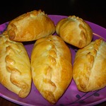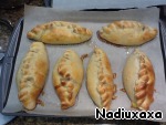 Выкладываем кибинай на противень, выстланый пекарской бумагой, на расстоянии друг от друга. Наши "кибинчики" увеличатся в объеме. Смазываем яйцом. Так же я ножницами прорезаю две маленькие дырочки, это делать не обязательно, но иногда у меня лопается тесто и вытекает сок, с дырочками такого не произойдет. И отправляем в 200С духовку на 20-30 минуток.
