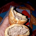 В начинке много мяса, лука, бульона. В поперечном разрезе это был треугольник,