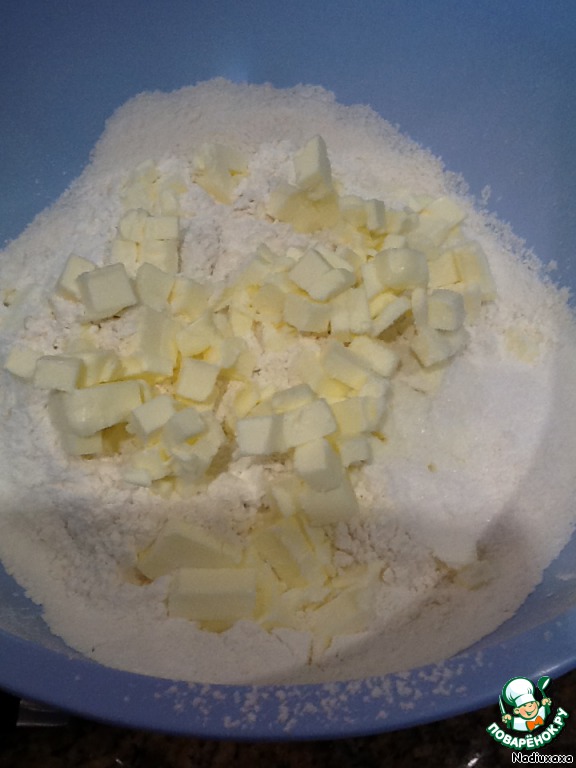 Просеиваем муку. Масло трем на терке или режем кубиком и бросаем в муку. Солим. Можно использовать маргарин, тогда соли не надо.