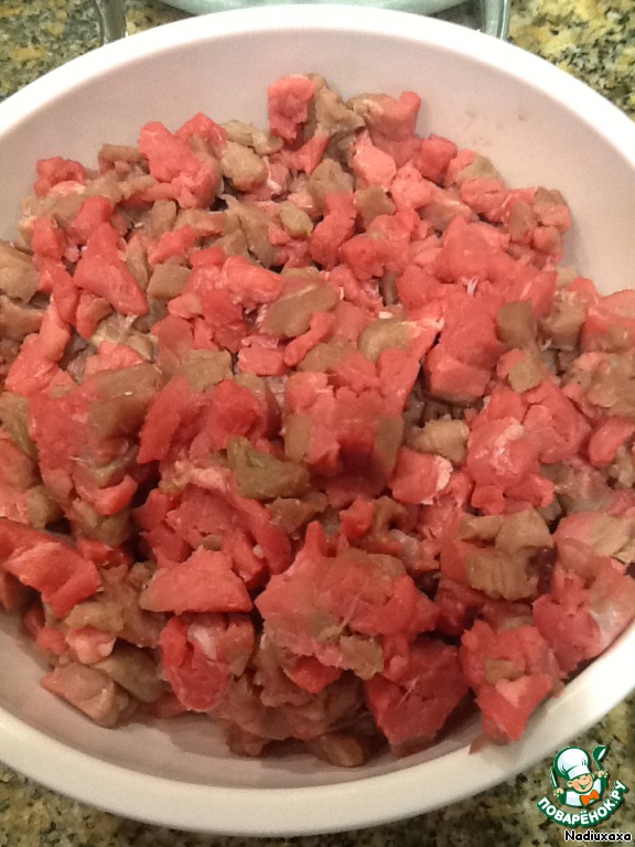 Пока тесто охлаждается, готовим начинку. Мясо режем мелким кубиком. Можно и перемолоть в мясорубке, но ведь мы готовим настоящие кибинай! Разница чувствуется, уж поверьте мне. Добавляем рубленый лучок и соль, не жалеем черного молотого перчика. Я считаю, что других специй не надо. Я также добавляю воду, т. к. использую нежирное мясо. Начинка должна быть очень сочной.