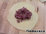 Итак, формируем пирожки. На один кибин уйдет где-то 70-100 г теста. Раскатываем круг из теста, в центр кладем начинку.