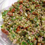 Смешиваем чечевицу с огурчиками, маслом с чесноком и луком, свежей зеленью и помидорами. Все, салат готов!