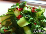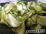 При помощи слайдера нарезаем в тарелку с заправкой огурцы длинными тонкими полосками, режем до семян (они дают слишком много влаги) с четырех сторон. Потом добавляем приготовленные листья кинзы, чили и посыпаем все кунжутом.