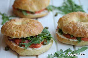 Посыпать каперсами и рукколой. Накрыть готовые бейглы второй половинкой. Получилась очень вкусная и интересная закуска для пикника. Моим домашним очень понравилось!