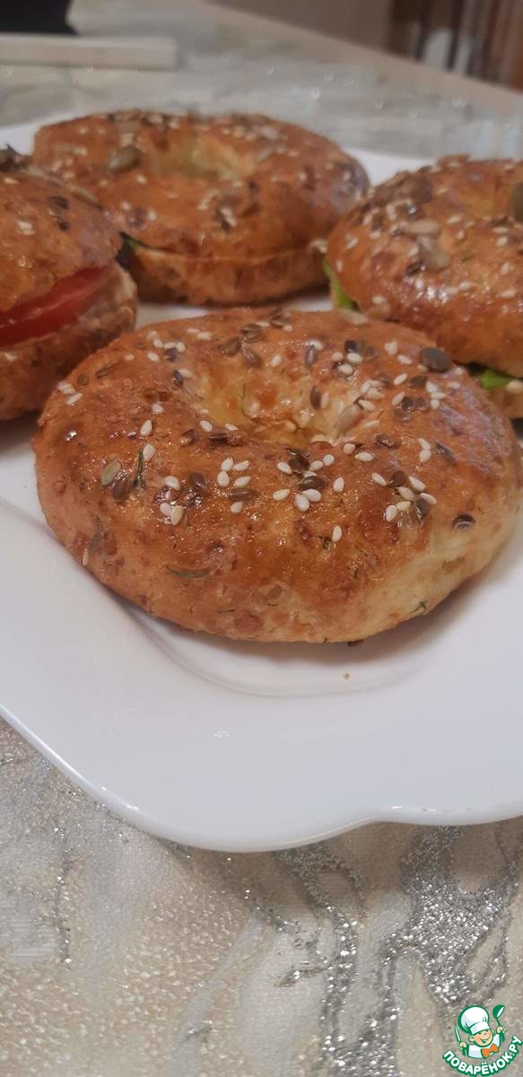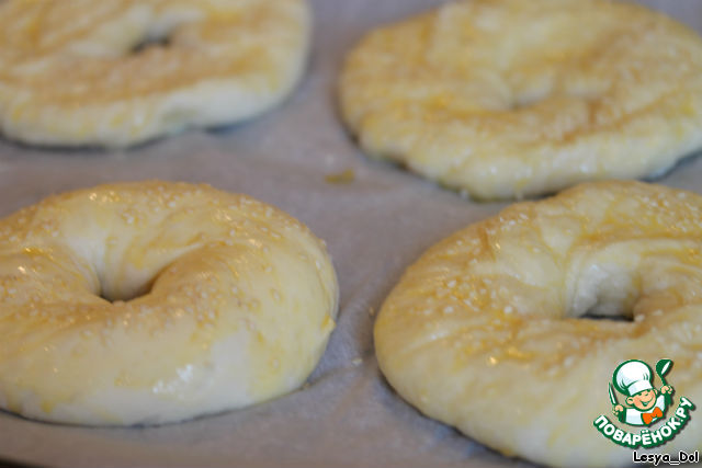 Противень выстелить бумагой и смазать растительным маслом, посыпать мукой. Выложить на него бейглы, смазать взбитым яйцом, посыпать кунжутом. Поставить в духовку и сразу же температуру снизить до 180 град. Некоторые бейглы у меня немножко опали во время охлаждения, но в духовке прекрасно подошли.