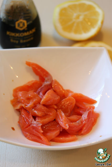 Пока тесто подходит, замаринуем филе лосося. Конечно, в идеале, можно было взять малосольное или копченое филе, но у меня в холодильнике нашелся только кусок свежего охлажденного лосося. Вот и рискнула приготовить из него. И не прогадала, получилось очень вкусно. Рыбу нарезать тоненькими полосками, смешать с соевым соусом и лимонным соком. Оставить мариноваться на 1-2 часа при комнатной температуре.