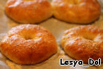 Каждую часть раскатать в "колбаску" и соединить в кольцо, смочив края теста водой. Бейглы выложить на бумагу и, накрыв полотенцем, дать подойти еще на 1 час. Духовку включить на 240 градусов.