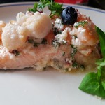 1. Сырые креветки и гребешки порезать на кусочки (можно и перекрутить, но кусочками вкуснее), смешать с маскапоне, зеленью, соком лимона, поперчить, (посолить, если нужно).