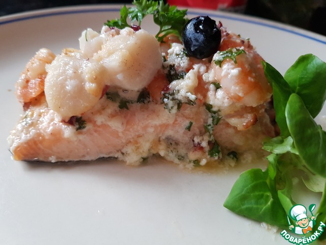 2. В лоток на фольгу положить филе, посыпать лимонным перцем, покрыть креветочной массой равномерным слоем.