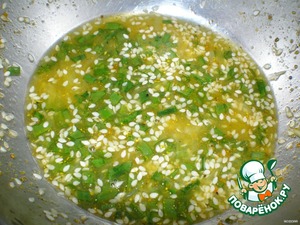 Натереть на крупной терке цедру с апельсина и лимона. Выдавить сок половины лимона и сок апельсина. Смешать, добавить 3 ч.л. кунжутных семян, острый карри, мелко нарезанные стебли зеленого лука, соль.