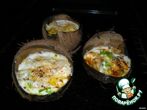 В ядра кокоса положить поджаренное филе, залить соусом и поставить в разогретую духовку до того момента, как соус загустеет. -