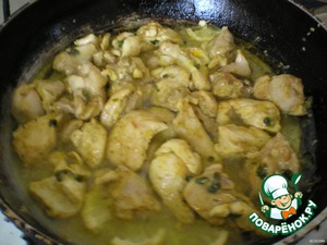 Разогреть масло на сковороде и обжарить куски филе 5 минут. Добавить маринад, 3 тоненьких кусочка лимона, нарезанных на четыре части, и сахар, перемешать. Жарить почти до готовности.