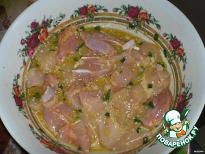 Куриное филе нарезать небольшими кусочками. Залить этой смесью куски курицы. Мариновать 1,5 часа.