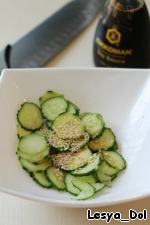 Свежие огурцы нарезать очень тонкими кружочками. Добавить соевый соус и семена кунжута. Оставить мариноваться 5-10 минут.
