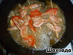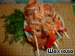 На деревянные шпажки нанизать креветки вперемешку с ломтиками помидоров