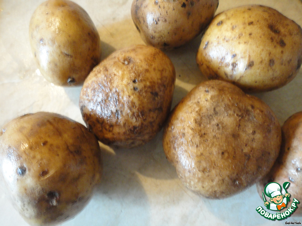 Отбираем некрупный картофель и отвариваем его в мундире в достаточно хорошо подсоленной воде. Сейчас дам пару советов по приготовлению картофеля в мундире, которые касаются не только этого блюда, но вообще приготовления картофеля для других блюд, как горячих, так и салатов. Солить воду обязательно, она делает картофель плотным, и он не будет рассыпаться при нарезании. При этом сам картофель внутри остается абсолютно не соленым. А второе: никогда не варите в мундире крупный картофель. Он варится долго, и пока середина проварится, края развариваются в хлам. Лучше возьмите средние или небольшие клубни.