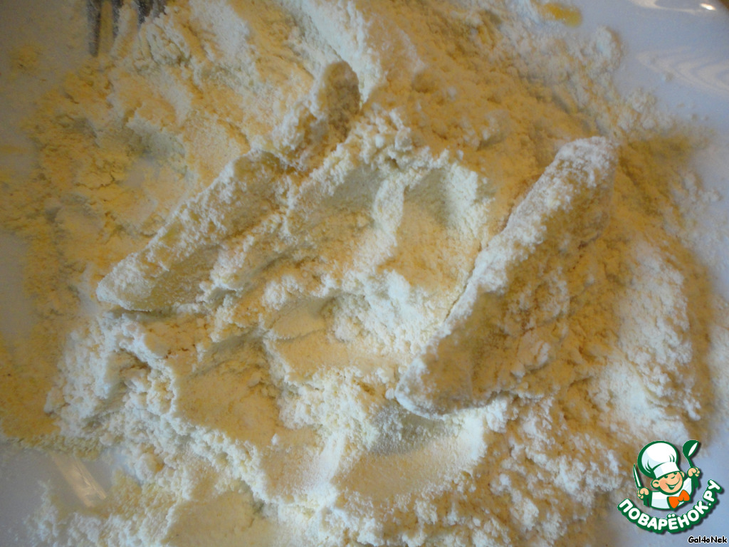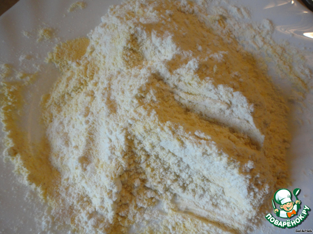 Пшеничную и кукурузную муку смешиваем. Можно в этом рецепте использовать только пшеничную муку, можно - крахмал. Но мне захотелось добавить кукурузной муки для привкуса и желтоватого цвета корочки. Яйцо разбиваем в тарелку, подсаливаем, взбиваем вилкой.
