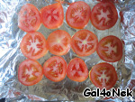 Стелим на противень фольгу, помидоры режем кольцами и выкладываем на фольгу.