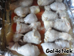 Сверху кладем меньший кусок фольги, заворачиваем конвертом. И отправляем в духовку при 180-200 градусах.