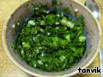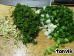 • 3.Пока мясо пропитывается, сделаем соус. Лук нарезать колечками, чеснок и укроп нарубить.