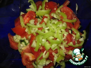 Болгарский перец чистим, разрезаем на 4 части и режем соломкой.