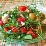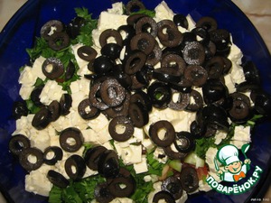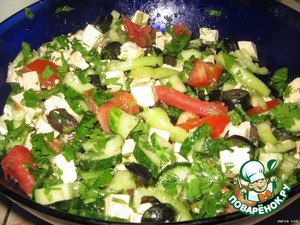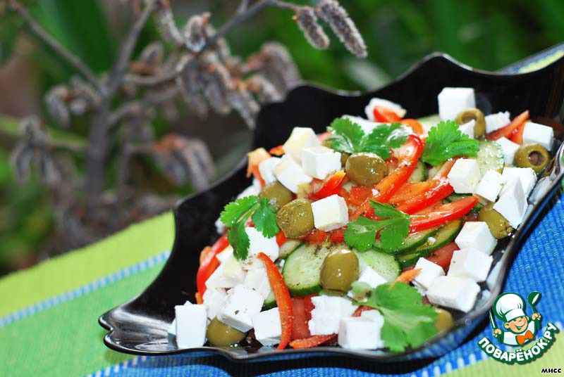 Слегка солим (брынза и маслинки уже содержат соль, поэтому не перестарайтесь!), заправляем оливковым маслом (можно, конечно и любым другим растительным, но лучше всё же оливковым), перемешиваем и всё: буйство красок на Вашем столе! Приятного аппетита!